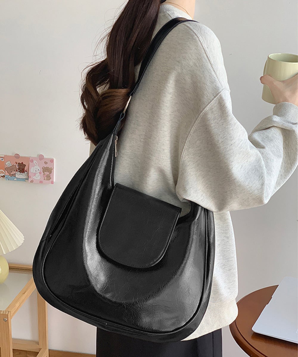 丸みを帯びたフォルムが柔らかい印象を与えるフラップ肩掛けバッグ。
