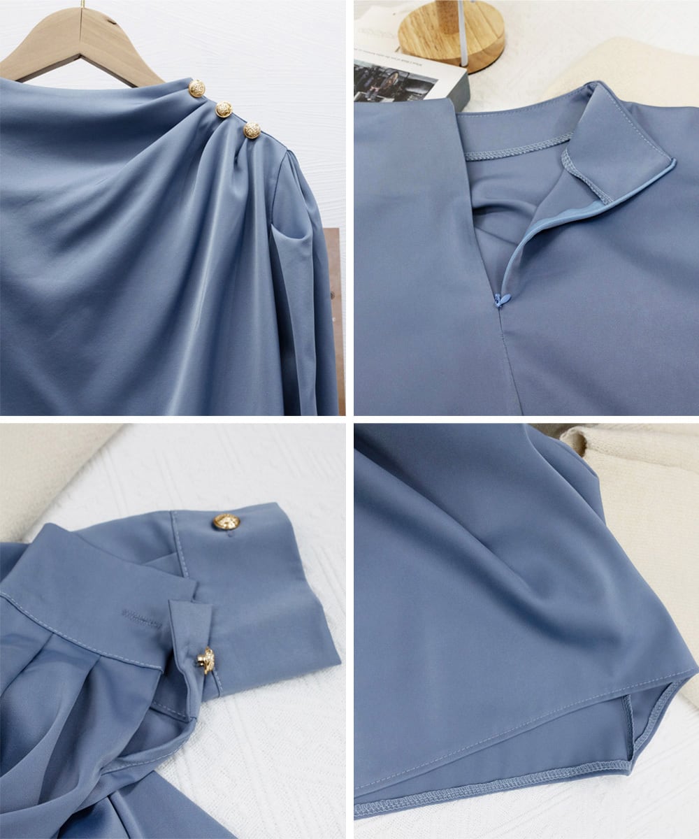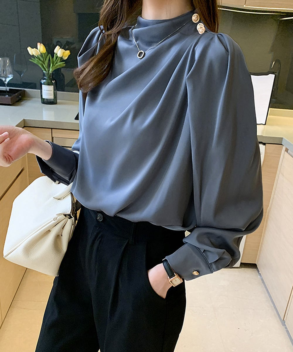肩のタックとボタンが目を惹く、女性らしいスタイリングにぴったりなブラウス