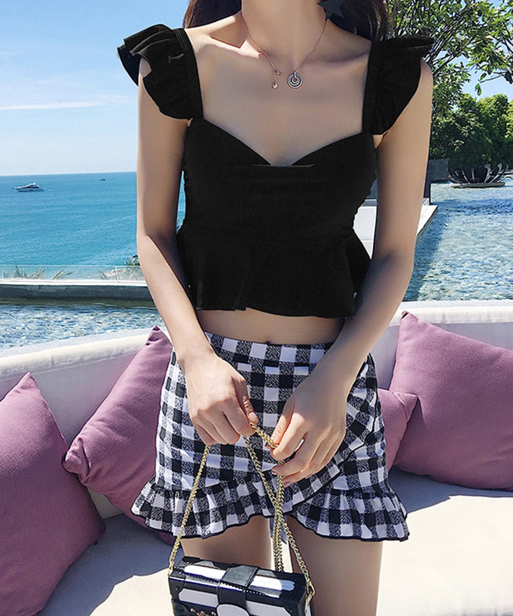 フリル付きギンガムチェック柄のかわいいセパレート水着。