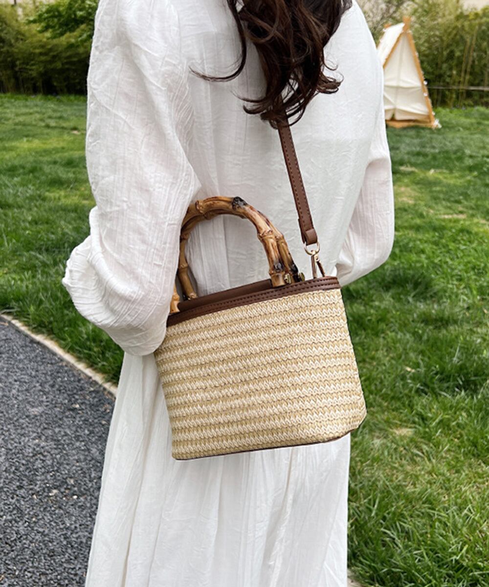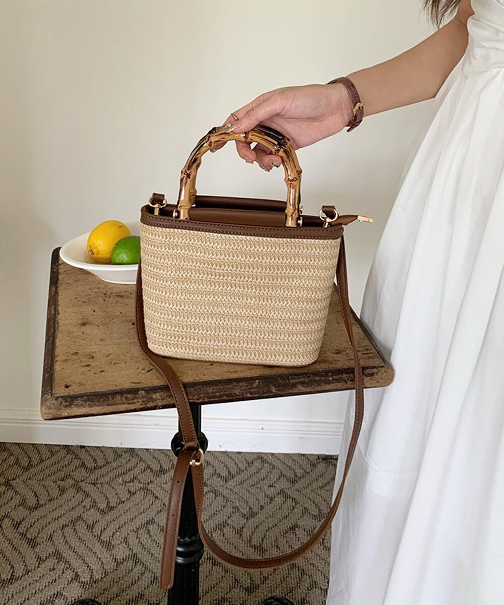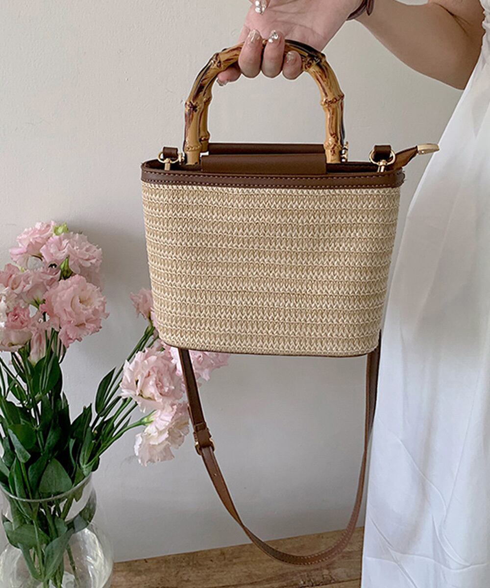 夏っぽい麦わら素材とフェイクレザーがカジュアルになり過ぎず、小さめで持ち運びも楽々