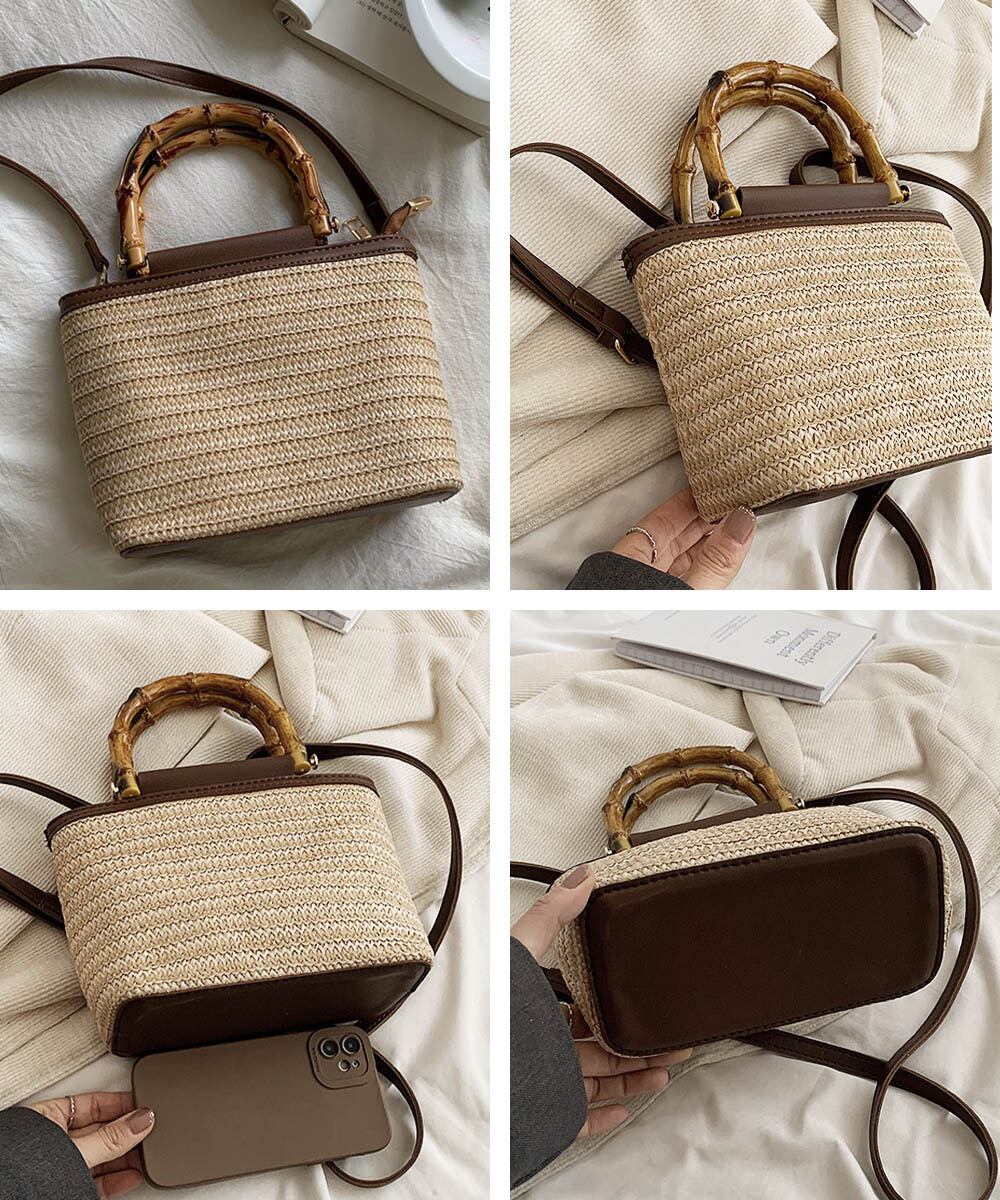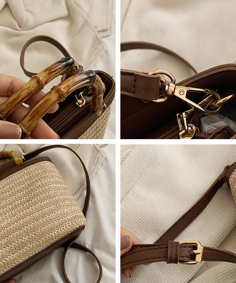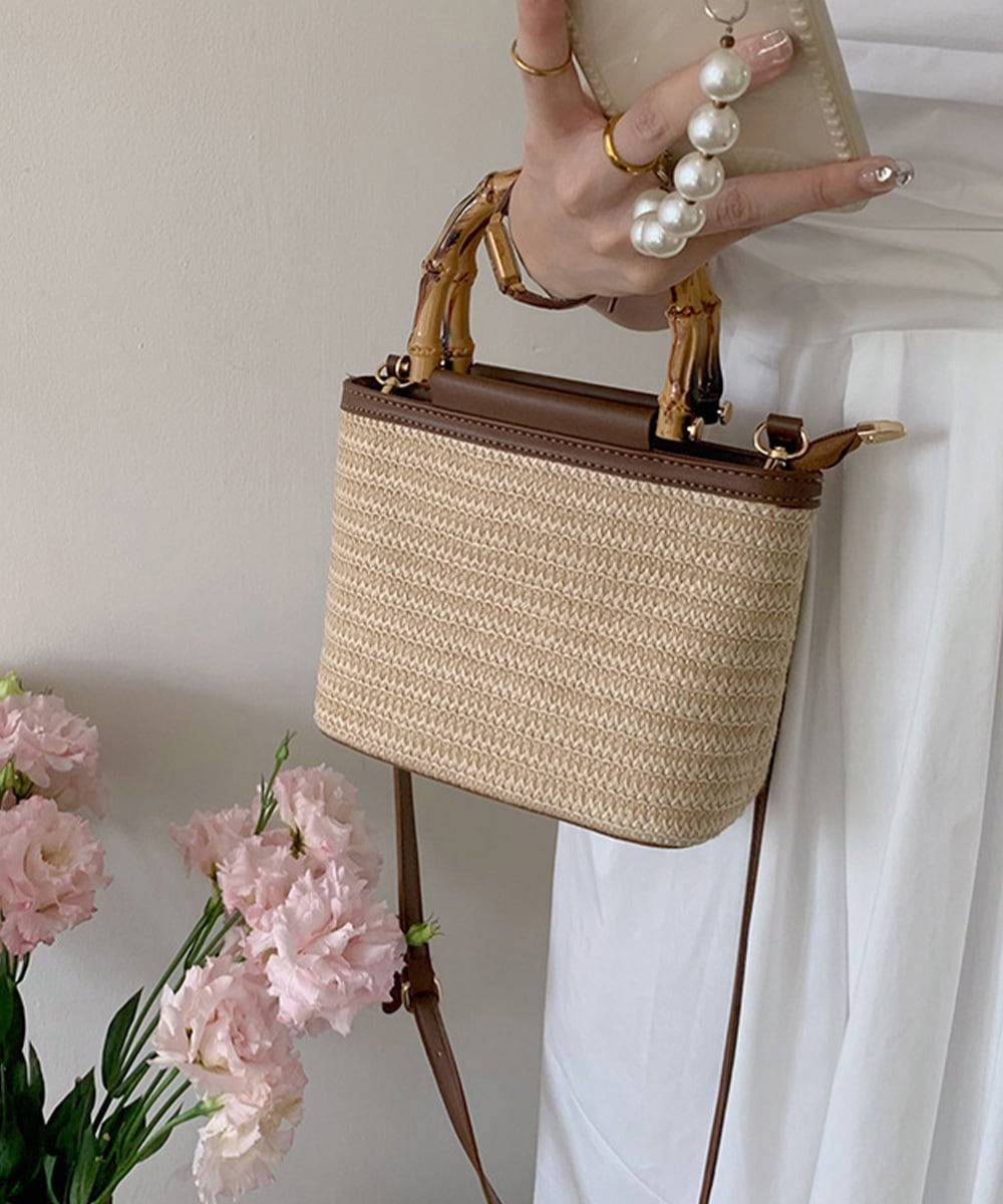 夏っぽい麦わら素材とフェイクレザーがカジュアルになり過ぎず、小さめで持ち運びも楽々