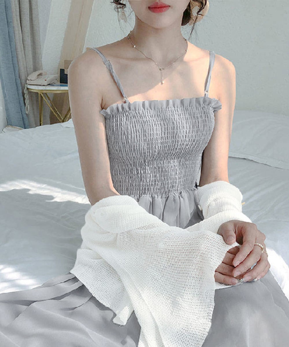 リゾート感たっぷりのキャミワンピースとシアーニットカーディガンのセットアップ。