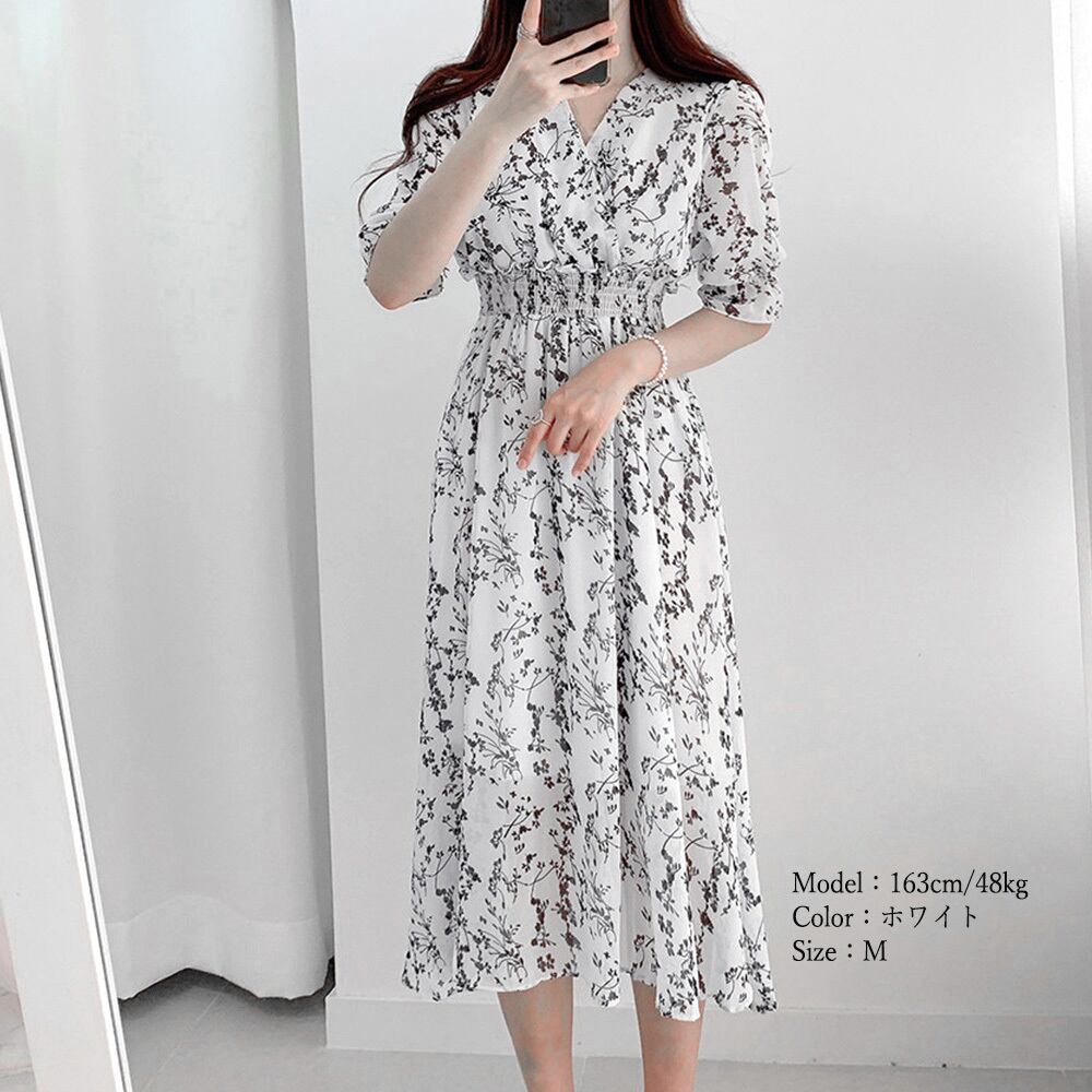 レディース 上品 Vネック ロングワンピース 半袖 リゾートワンピ レジャー旅行 大人サマーワンピ ウエストマーク韓国風