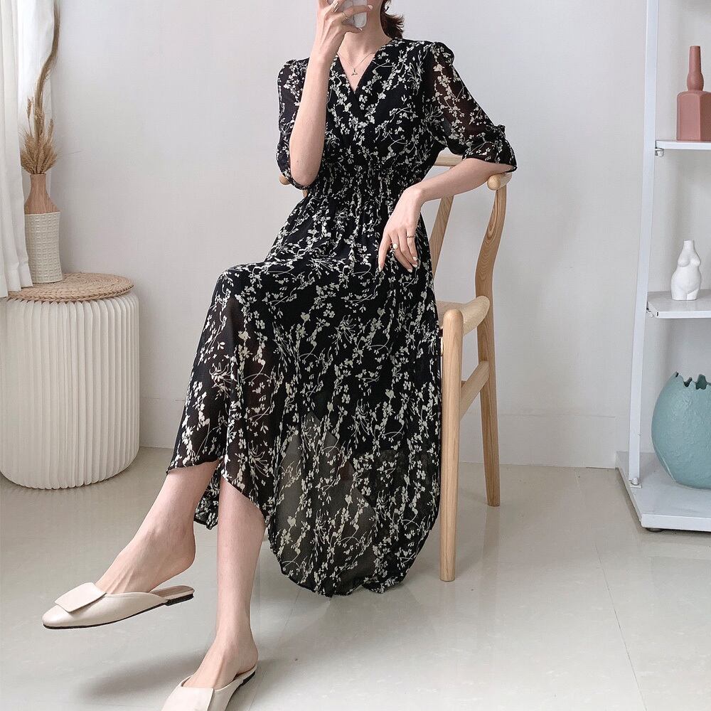 夏ワンピース細見え シフォンワンピ 黒 レトロ風フェミニン