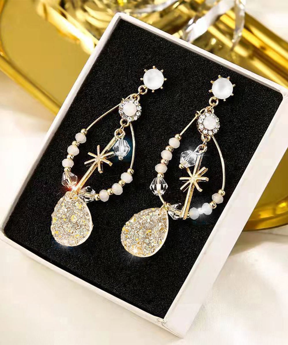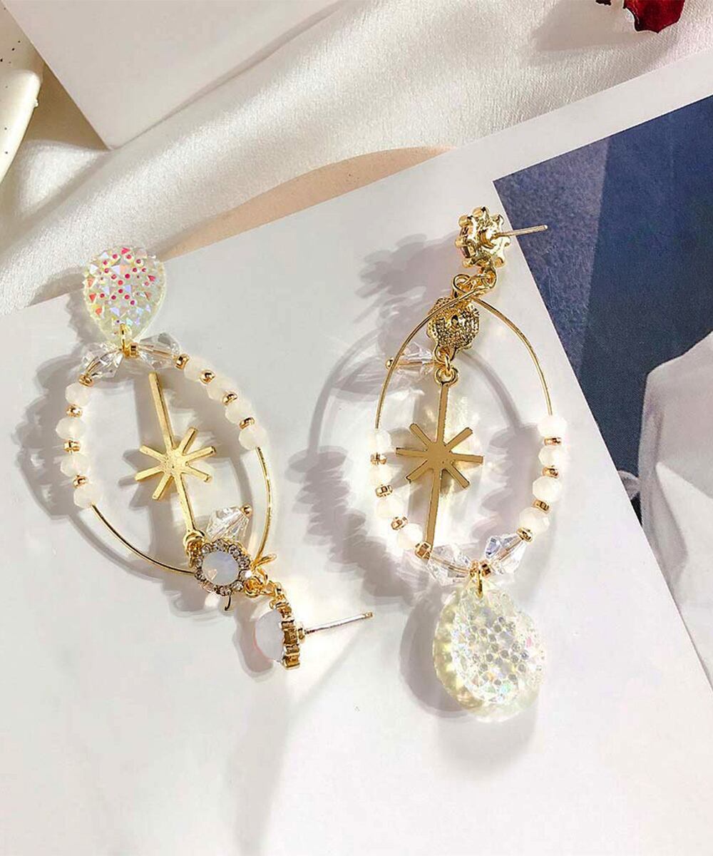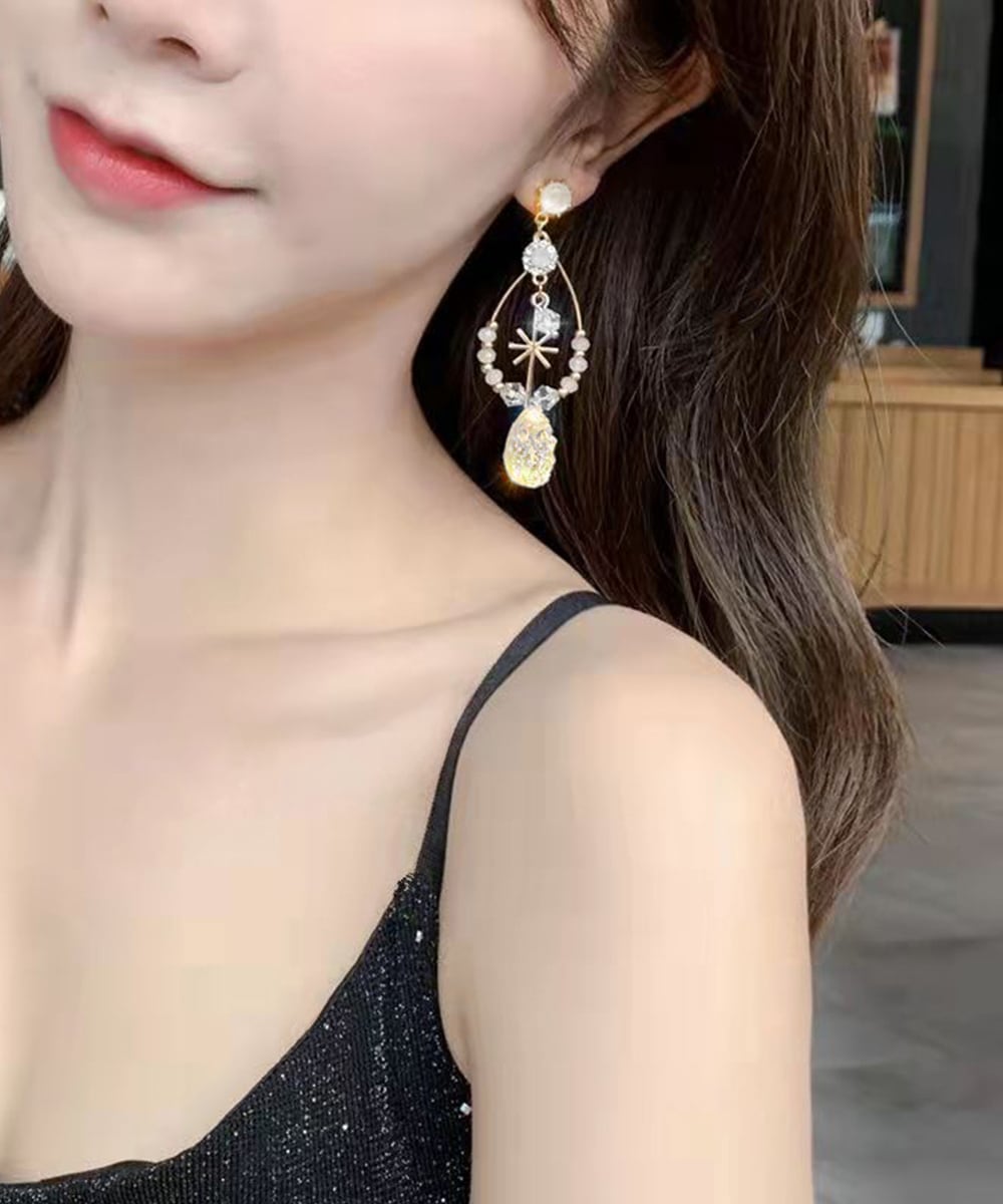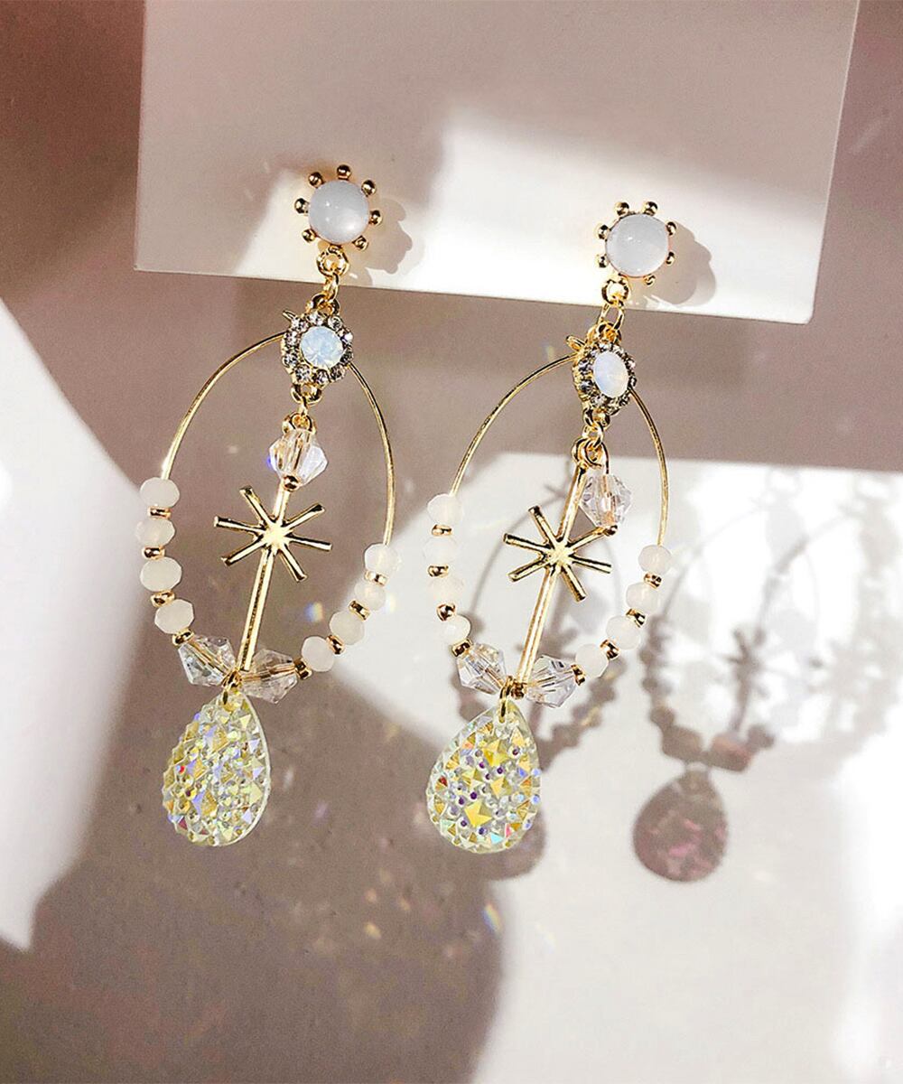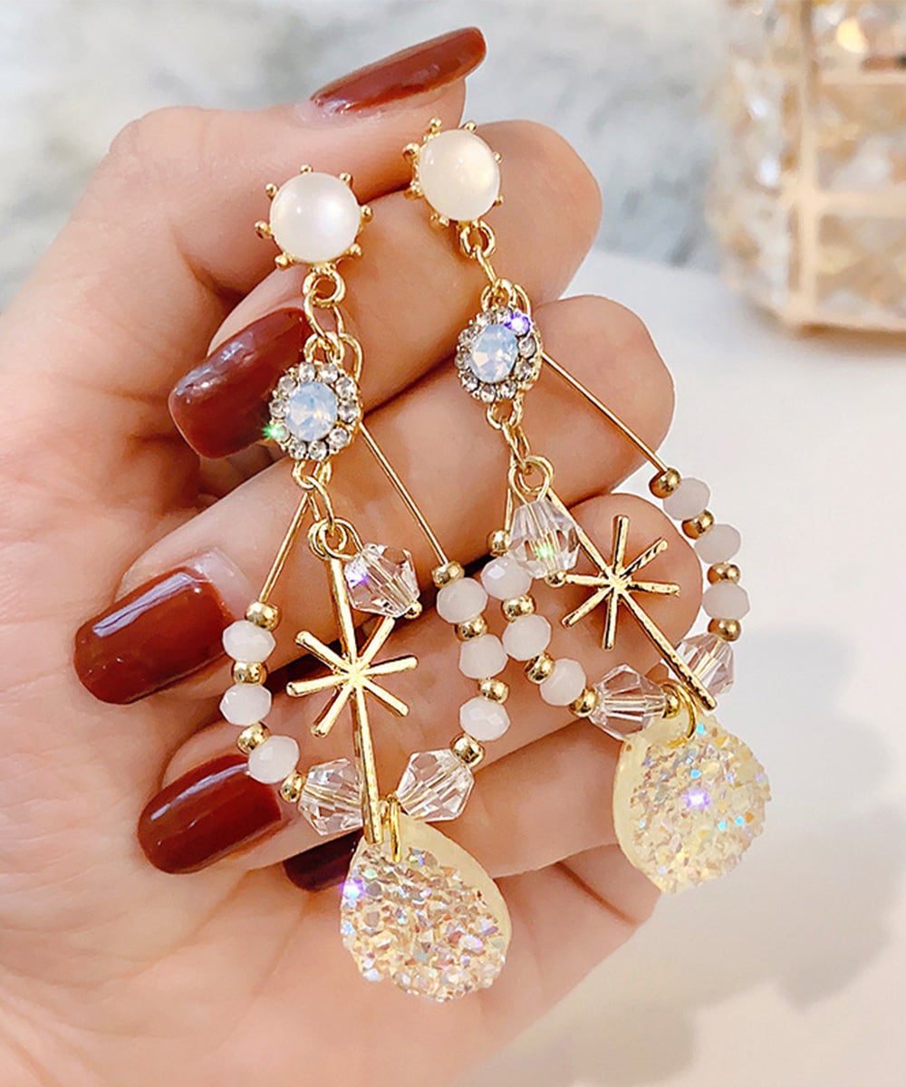 Korean-style dangling earrings for women. Cute and sophisticated, these stylish earrings are elegant and exotic. These unique, bohemian-inspired earrings are a perfect spring/summer accessory. These oversized earrings feature a wire motif, beaded with jewels, and rhinestones. Their refreshing seasonal design creates a striking statement, adding a touch of glamour to your ears. The charming swaying silhouette creates a perfect complement to the light, girly, and feminine look of spring and summer.